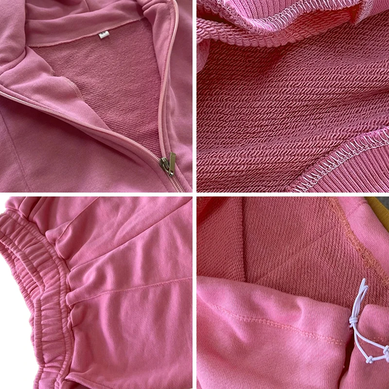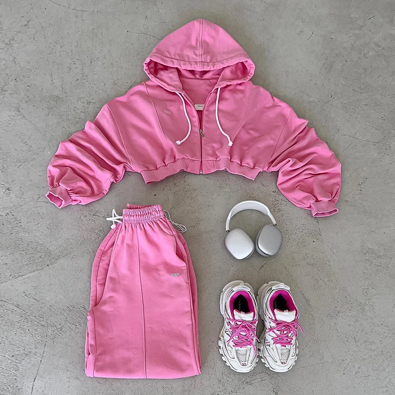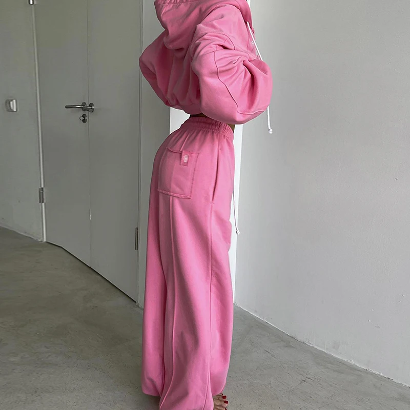 Women's Pink Crop Top Hoodie Set 100% Cotton Custom Logo French Terry Acid Wash Technique 2-Piece Tracksuit Loose Fit Hooded